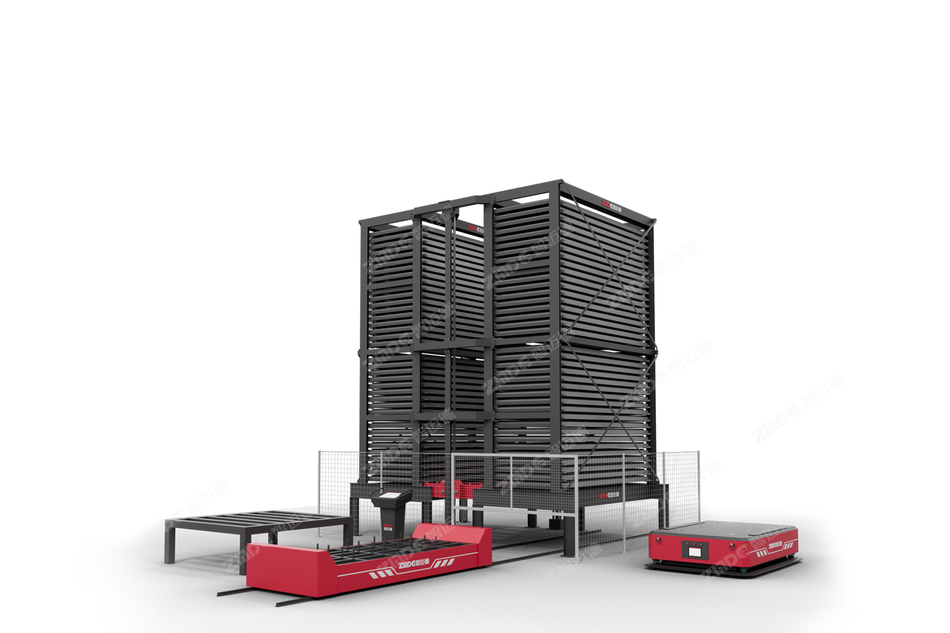 ①智邁德智慧儲倉包含高層貨架、天地軌道、巷道堆垛機、背負舉升式AGV小車自動化搬運設備,自動控制與管理系統組成,主要用于整托板材的分類存儲。