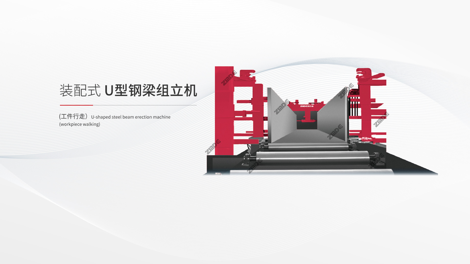 智邁德裝配式U型鋼梁組立機(工件行走)用于箱型梁組裝中U型和箱型的組裝成型工序。工件放置于帶有輔助對中裝置的傳送帶上,電機驅動工件進入工作區域,固定門架的上壓缸及側壓缸與傳送帶的對中裝置壓緊工件的腹板及翼板組裝成型并點固。